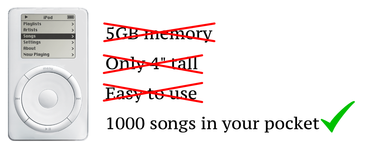 Apple hat der Versuchung widerstanden, zu viele Vorzüge in den Text hinein zu quetschen; Sie haben sich auf nur zwei beschränkt: den Speicherumfang und die kompakte Bauweise. Diese haben sie auch nicht explizit genannt, sondern in einem Vorstellungsbild kombiniert: 1,000 Lieder in deiner Jackentasche zeigt jedem sofort, welche Vorteile er von dem iPod hat. (Damals waren Geräte mit einem vergleichbaren Speicher wesentlich größer, und kompakte Geräte hatten nur sehr wenig Speicher.)